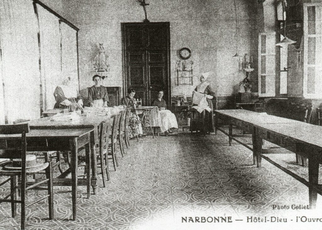 A cette époque les Sœurs allaient visiter les malades dans les différents hôpitaux de la ville. L’acte de fondation de 1670 mentionne :  «  En ce qui concerne la nourriture et le traitement des pauvres malades, les dites filles seront entièrement soumises aux Dames Officières de la Confrérie de la Charité anciennement établies dans la ville de Narbonne, desquelles et particulièrement de la supérieure, elles exécuteront ponctuellement les ordres pour la réception et le congé des malades, auxquels elles feront cuire les viandes, porteront les bouillons, prépareront les remèdes et médecines, distribueront aussi toutes les douceurs et commodités qui leur seront fournies par les dites dames ».