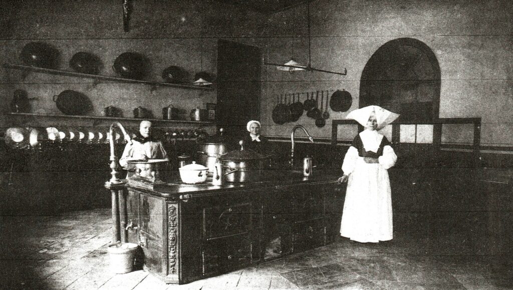 Le service est confié à huit Sœurs dont une Supérieure qui veille avec le plus grand soin à l’administration générale de la maison. Deux autres Sœurs sont employées à la pharmacie ; quatre Sœurs sont chargées du soin des malades et la huitième est occupée au service de la cuisine. Elles ont huit domestiques chargés de pourvoir aux besoins des malades, un chapelain et un secrétaire.